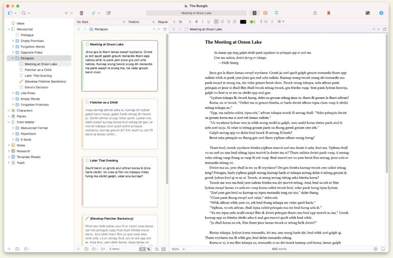Imagine having a virtual corkboard where you can pin index cards representing different parts of your manuscript. This innovative feature enables easy planning and rearranging of sections within a project, making it simple to visualize and reorganize the flow of your narrative.